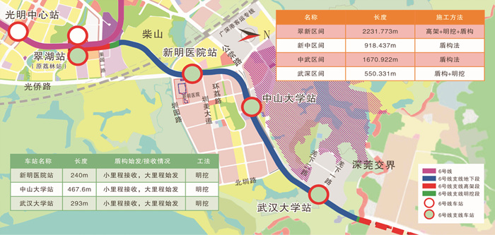 中交二公局負責(zé)深圳軌道交通6號線支線工程4站4區(qū)間施工任務(wù),線路長6.119公里,其中高架段長436米,地下段長5294米,過渡段總長140米。