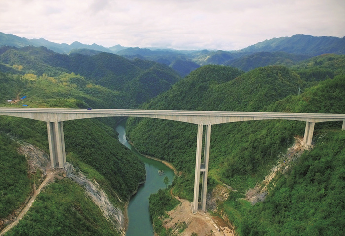 1122.5m Kaixia River Bridge of Jiangkou-Weng'an Expressway in GuizhouProvince has a main bridge of variable section prestressed concrete continuousrigid frame box girderis, in 118+220+160+58m. The maximum pier is up to 140m.Its main span ranked the first of its kind at that time. The construction ofthe high pier and long span continuous steel structure is very difficult.