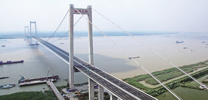 江蘇泰州長(zhǎng)江公路大橋跨江主橋是世界首座千米級(jí)三塔雙跨懸索橋,主跨徑為2×1080米,創(chuàng)造了五項(xiàng)世界第一。泰州長(zhǎng)江公路大橋榮獲英國(guó)結(jié)構(gòu)工程師學(xué)會(huì)頒發(fā)的卓越結(jié)構(gòu)工程獎(jiǎng)、國(guó)際橋梁及結(jié)構(gòu)工程協(xié)會(huì)頒發(fā)的杰出結(jié)構(gòu)工程獎(jiǎng)。
