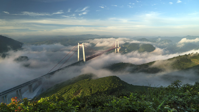 貴州貴甕高速公路清水河大橋主跨徑1130米,是世界最大跨度的板桁結(jié)合加勁梁懸索橋,橋面距谷底高達(dá)406米,2015年12月通車,創(chuàng)造了29個(gè)月建成千米級懸索橋的世界紀(jì)錄,獲得中外媒體廣泛關(guān)注,被譽(yù)為“真正的中國制造”。